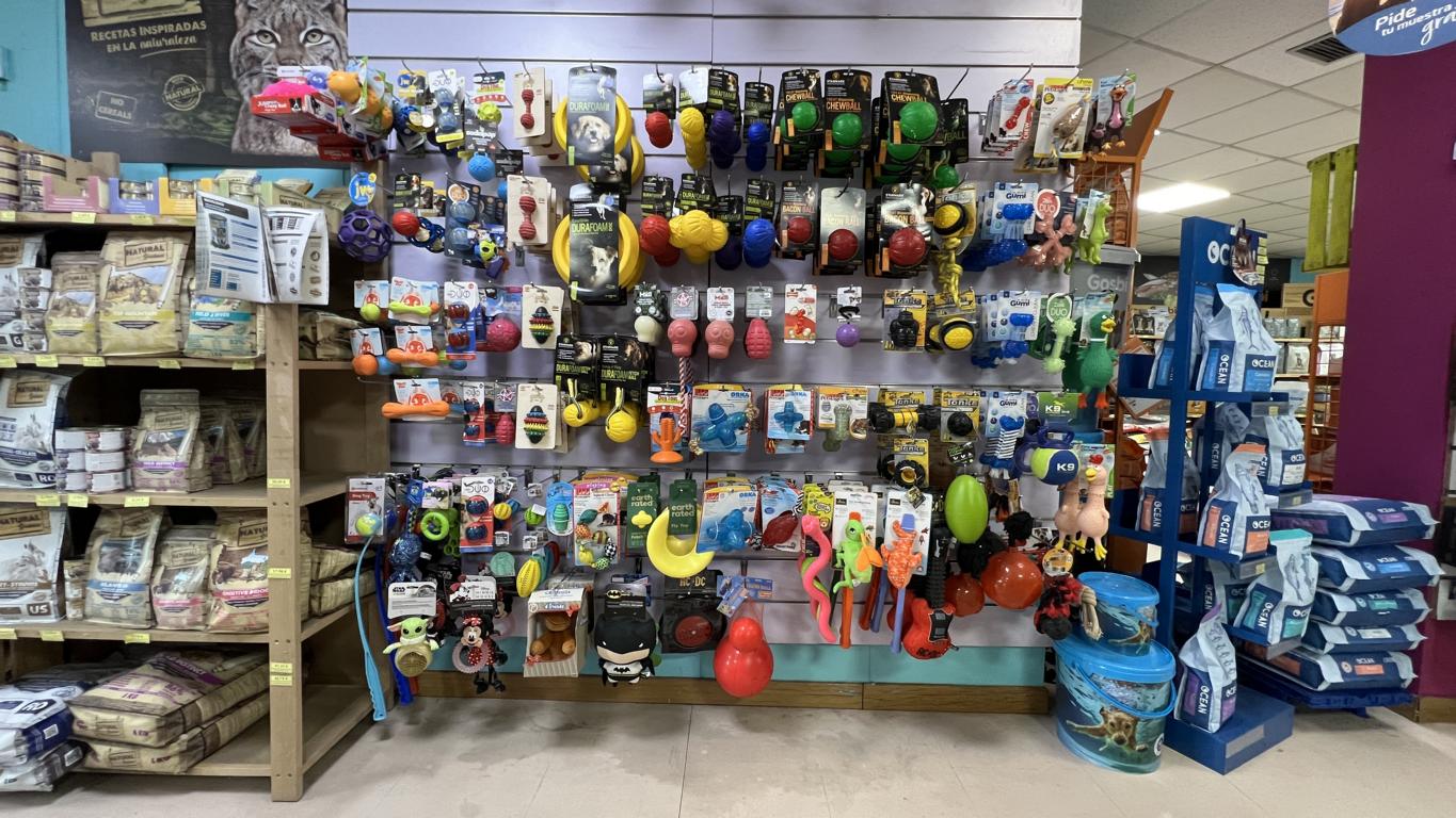 El surtido de juguetes es enorme: peluches, mordedores, pelotas y accesorios para hacer más feliz a cada mascota. La variedad de productos permite encontrar opciones tanto para perros como para gatos.